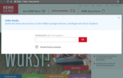 Ich wollte etwas beim REWE Lieferdienst bestellen. Da aber auch andere Familienmitglieder mitbestellen sollen, ist es wichtig, dass wir zu unterschiedlichen Zeiten bestellen können, denn nicht alle sind zum gleichen Zeitpunkt vor dem Endgerät. Erst wollte ich auf shop.rewe.de die Hilfe aufrufen. Aber man kommt hier nicht weiter, wenn man nicht die Postleitzahl eingibt. Hmm, ich will doch noch gar nicht bestellen, sondern mich nur informieren, wie lange der Warenkorb bestehen bleibt.