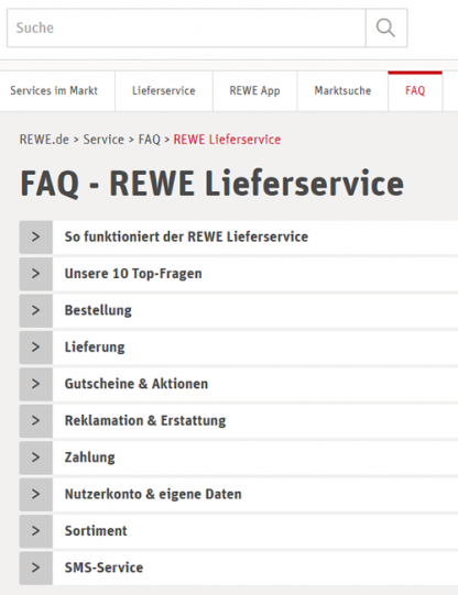 Bei Nichteingabe der Postleitzahl wird man zu rewe.de weitergeleitet. Zum Glück habe ich gemerkt, dass es dort eine FAQ zum Lieferdienst gibt. Hier war ich erstmal begeistert, dass eine Suche existiert.