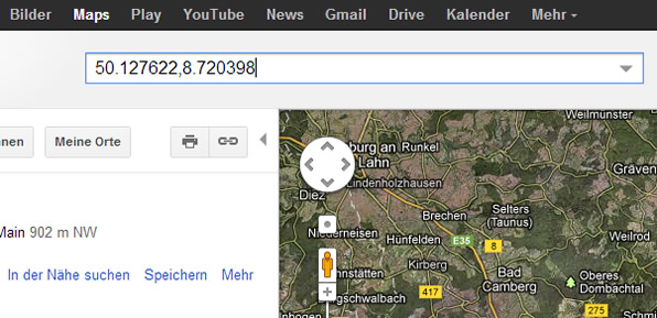 Die Koordinaten werden automatisch im Suchfeld angezeigt.